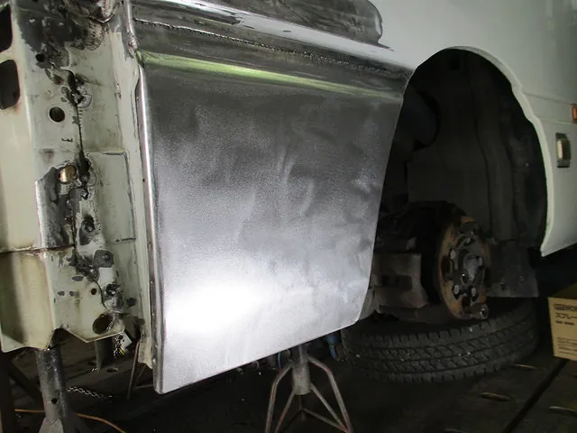 フェンダーを丸々交換するととても高価なので、こちらは当工場が得意とする『鉄板から部品を作り溶接』という手法でいきます。