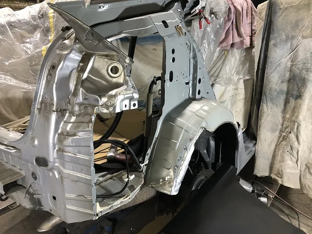 リアバンパーを外して右テールランプを外し、右クォーターパネルを部分的に移植手術します