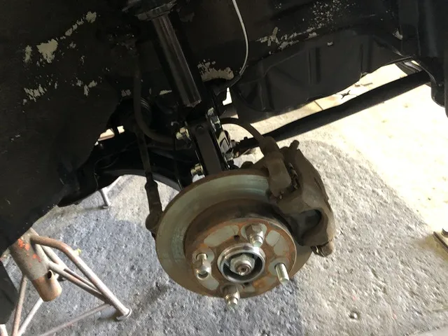 そしてジャッキアップして足回りの部品を交換してタイヤもフロント左右交換しホイール一本交換します