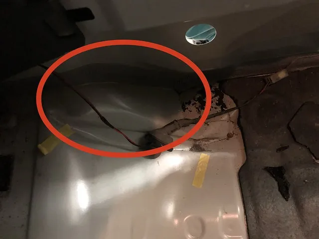 ゲートを開けて車載工具が積んである荷台を見てみますと赤丸で囲んだ場所ですがシワが寄って変形しています
