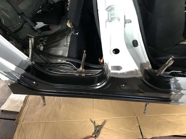 保険修理という事でホイール、タイヤ、サイドシルを新品に交換しますが、サイドシルの損傷部分を切り取り、その部分だけ新品に交換という高度な技術が必要です