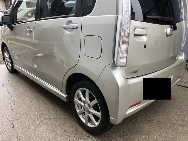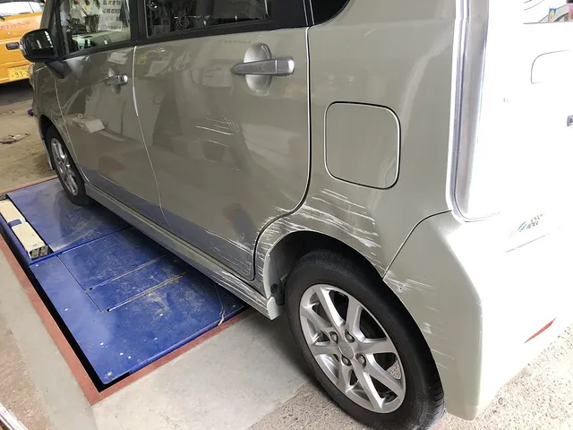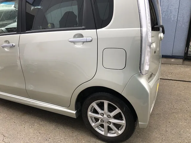 ダイハツの人気車ムーブの左後ろ、リアバンパー、クォーターパネル、リアドア、サイドスポイラーの傷の修理事例です