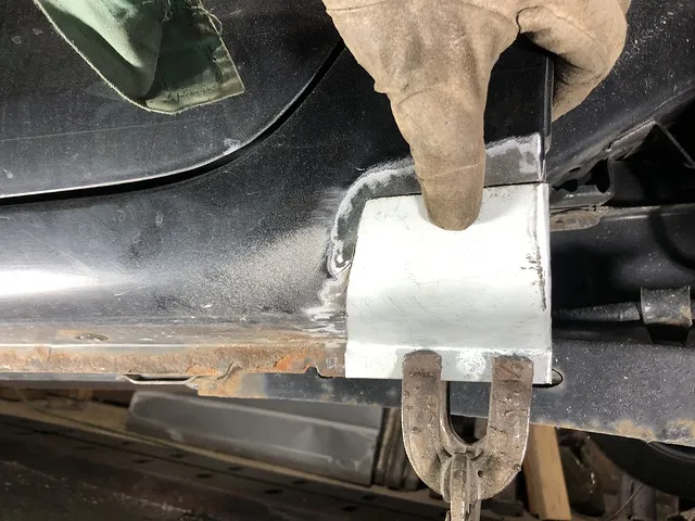 サイドシルの錆は切り取り、当工場の得意分野の部品を作り溶接で対応します。鉄板を切り出し、叩いて曲げて加工して溶接後に研磨して滑らかにし細かい凹凸をパテで埋めます