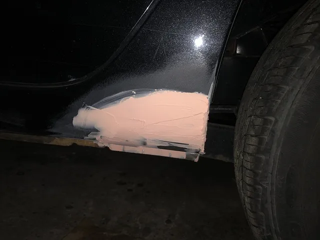 フロントフェンダー、フロントバンパーの傷はフロントバンパーを外して傷が無くなるまでダブルアクションサンダーという工具で研磨して滑らかにし、硬化剤を混ぜたパテを塗り付け乾燥後、サイドシル共に車体本来の曲線を再現するように研磨して紙を貼りマスキングします