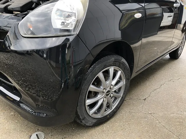 ダイハツのミライースのフロントバンパーの傷とフロントフェンダーの傷、左後ろのサイドシルの錆修理です