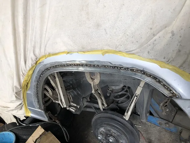 鉄板を叩いたり曲げたりしてリアフェンダーの代用品を作り溶接しました