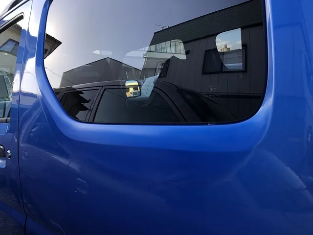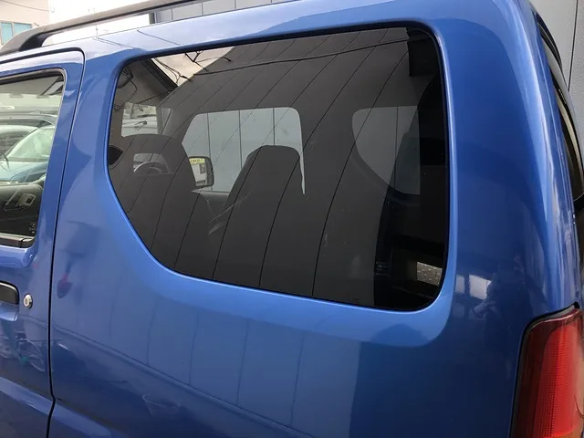 スズキのジムニーの左の後部座席や荷台あたりの窓の下が写真だとわかりにくいのですが塗装の色がぼんやりとしています