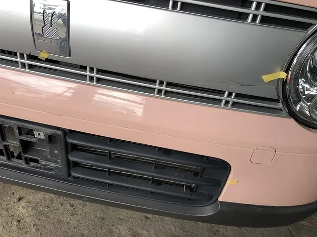 八戸市 八戸市 板金塗装 ラパン 前側の損傷 バンパーと左ヘッドライト、エアコンコンデンサ 谷川自動車