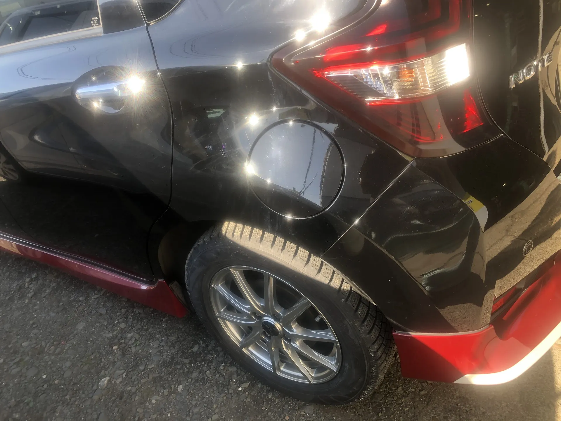 ニッサンのノートのこちらはハイブリッド?リアドア、リアフェンダーの2面の傷とホイールの傷の事例です