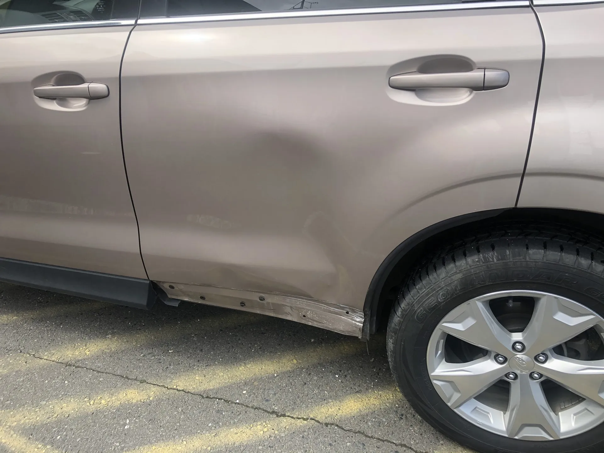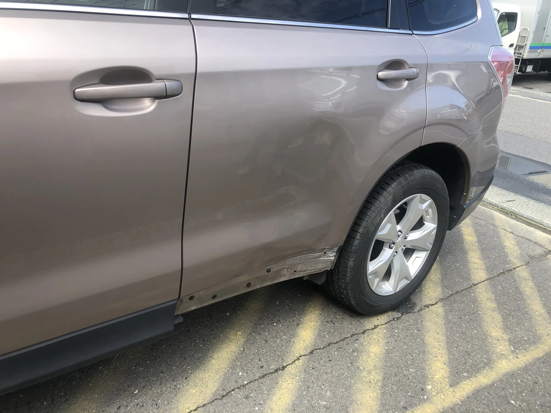 スバルのフォレスターのドアの大きな凹みとタイヤの傷の事例です