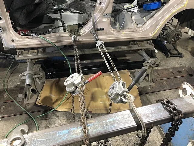 右側の写真がフレーム修正機に乗せた状態で修正機に車が固定されています。そこで、地面にいかついボルトでがっちり固定されたタワーに支柱を乗せてあり、プーラという1トンとかの力でチェーンを巻き取れる工具をくくりつけ、車内側に押し込まれた床を引っ張り、時にはごついハンマーで盛り上がった床を叩いたりして出来る限り無傷のフレームの位置関係に修正します。