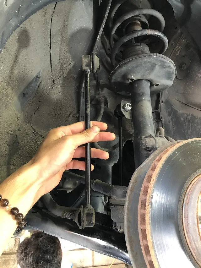 今回の原因はこの棒状の部品、スタビリティリンクのがたつきでした。上下の衝撃を緩和しているスタビリティリンクですが、上と下に人間で言う所の関節の役割を果たすボールジョイントがあるのですが、これが劣化してくる?隙間が出来てくる?とコクコクとがたつきが出てくるようになります