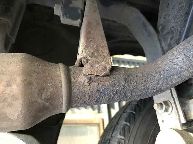 八戸市 マフラー、フレームの穴修理 キャリィ マフラーとハンガーの補強溶接 2箇所