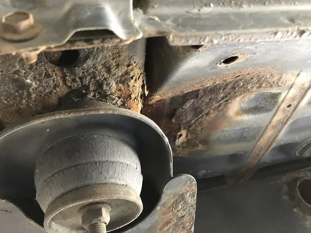 八戸市 マフラー、フレームの穴の修理 ジムニー メンバ ボディマウントゴム付近の腐食