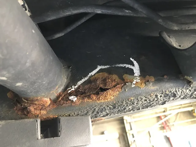 八戸市 車のマフラー、フレームの穴の修理 ソニカ リアショック付近の大きな穴と床の穴