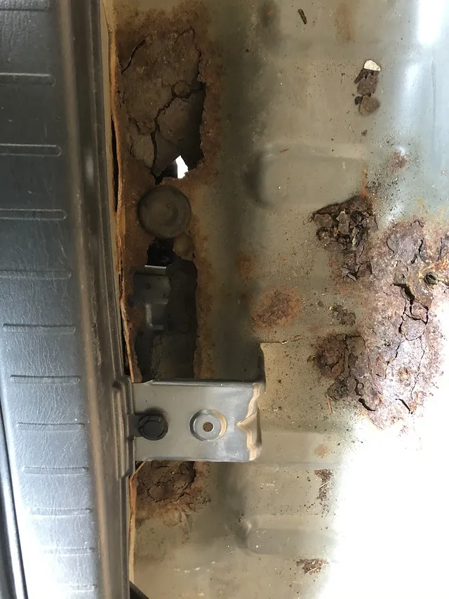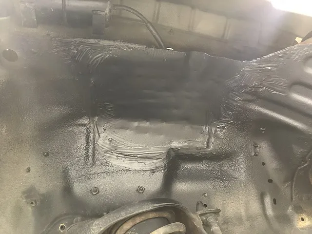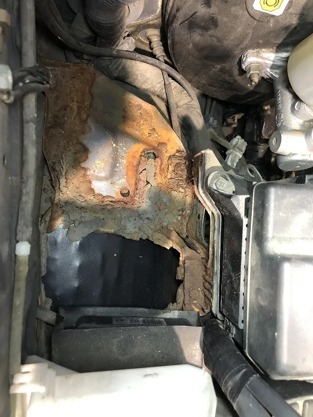 また別の写真ではエンジンルームからタイヤハウス(前側のタイヤが付いている場所)を覗きますとタイヤが見えるくらい穴が空いていまして、写真は既にタイヤハウス側から防錆剤を塗りこんだ黒い鉄板を溶接した状態です。相当でかい穴が空いておりまして、この上にバッテリーの乗るケースがあり、そこにバッテリー(まあまあの重さ)が乗っている感じでした