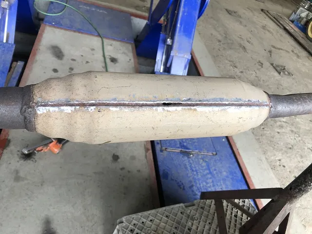 このマフラーの太くなっている部分の上側から排気漏れして謎の異音を発していました汗