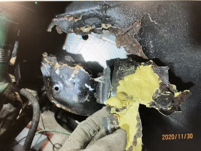 写真では分かりづらいかも知れませんがこの部分は穴が空いていますと車検が通りません。フレームや足回り等も穴が空いていますと車検が通りませんのだ鉄板を当てて溶接する必要があります